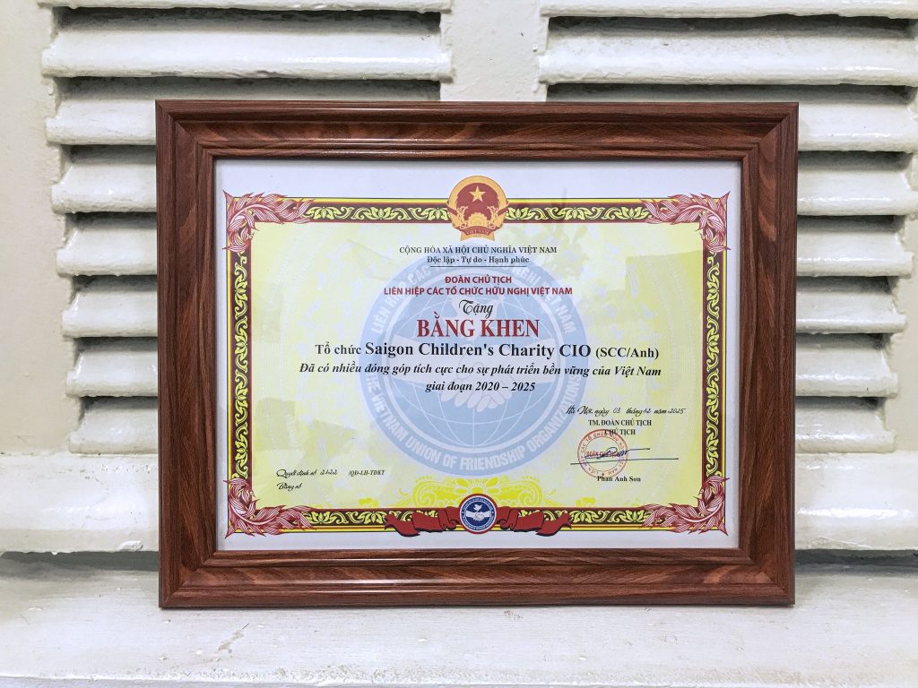 On the morning of 4 December in Hà Nội, Saigon Children’s Charity was honoured to receive a Certificate of Merit and a commemorative trophy from the Viet Nam Union of Friendship Organizations (VUFO), recognising the charity’s contributions to sustainable development in Vietnam during 2020-2025.