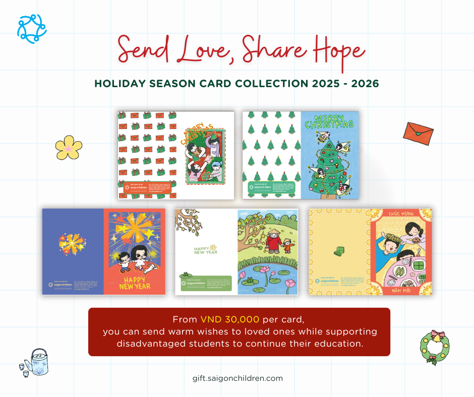 Như một thông lệ hàng năm, saigonchildren hân hạnh giới thiệu đến bạn bộ thiệp mùa lễ hội cuối năm 2025 – 2026 với những thiết kế mới nhất, để cùng bạn háo hức trao gửi lời chúc ấm áp đến những người thân thương.
